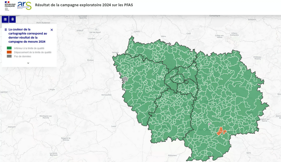 Le 25 septembre 2025, L’Agence Régionale de Santé s’est félicité d’être à l’avant-garde pour la surveillance des PFAS dans l’eau de consommation humaine en Île-de-France : l’ARS a en effet édité une cartographie régionale quasi-totalement verte, indiquant une absence générale de risques en matière de PFAS dans les captages, qu’ils soient souterrains ou de surface.