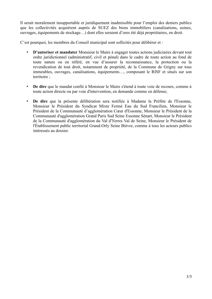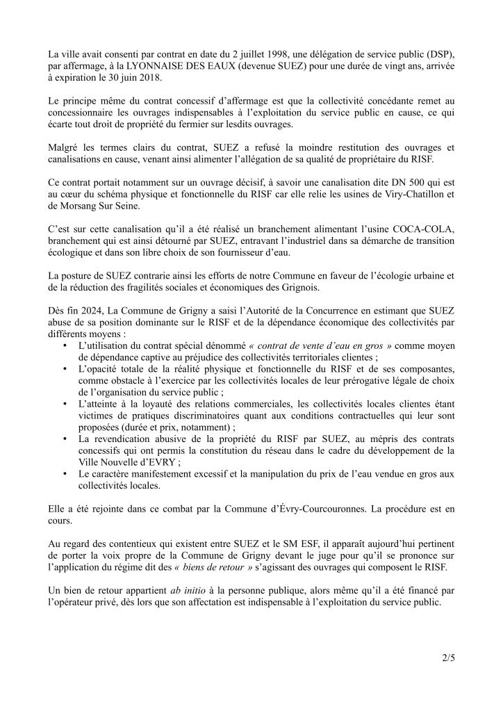La démarche salutaire de la Ville de Grigny en première ligne pour recouvrer, enfin, la maitrise et la propriété de nos installations de production d’eau potable du RISF offre une opportunité salutaire d’en finir avec ce cauchemar