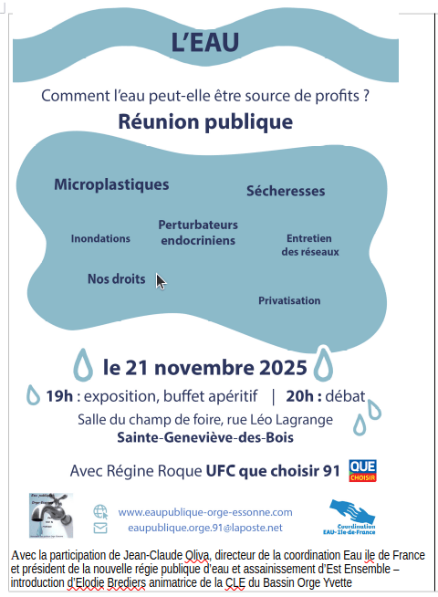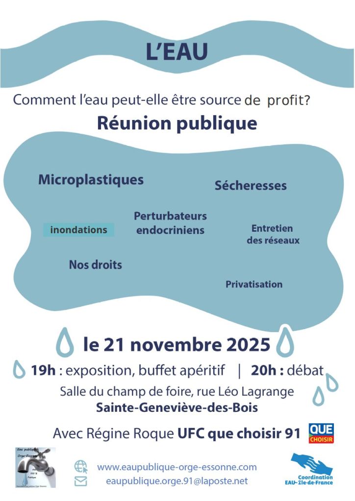 Electeurs, candidats, rendez-vous vendredi prochain à Sainte-Geneviève-des -Bois,pour une discussion en directe, à l’encontre du secret des affaires que les multinationales Suez et Veolia veulent imposer dans ce domaine vital.