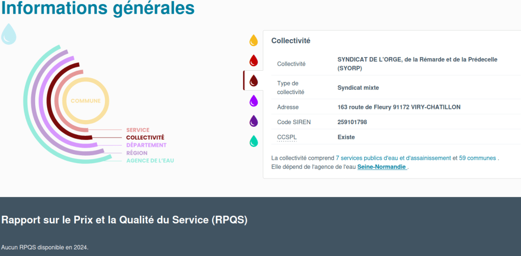 Capture d’écran de la page du syndicat de l’Orge sur le site national officiel Eau France auquel toutes les opérateurs doivent transmettre leur données: Pas une seule fois, le Syndicat n’y a transmis sont rapport annuel (RPQS) depuis 2008, et sa page indique l’existence d’une CCSPL, remplacée en faite par une commission informelle et impuissante dont les dirigeants ont évincé du jour au lendemain notre association