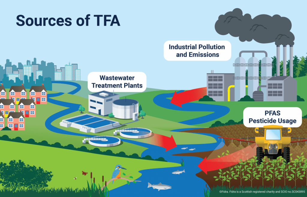 Certains pesticides ou adjuvants de pesticides largement utilisés en agriculture qui sont eux-mêmes des PFAS, sont connus pour se décomposer en acide trifluoroacétique (TFA), un PFAS à chaîne ultra-courte, étonnamment oublié la réglementation. [6]