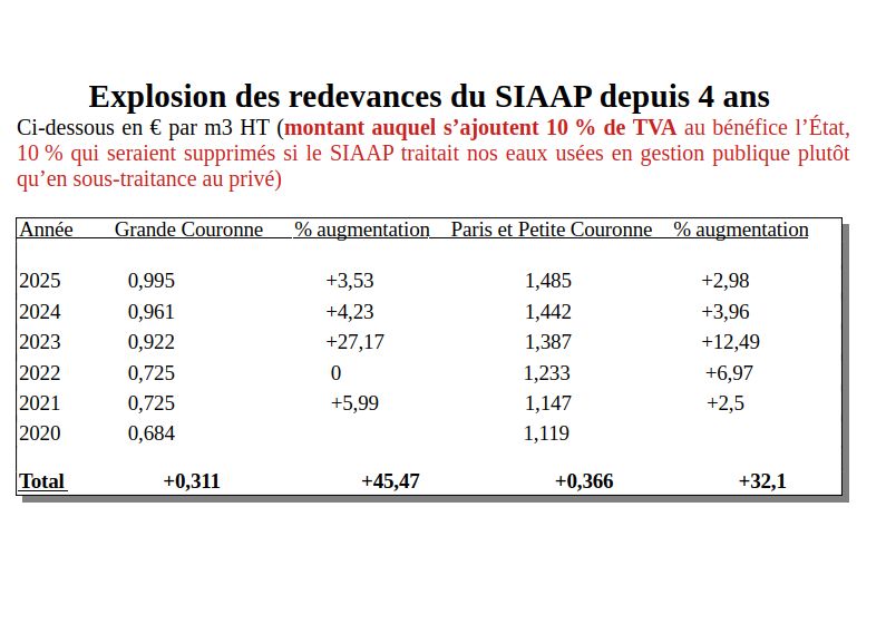 * La redevance reversée au SIAAP ( pour l’épuration des eaux usées) est malheureusement soumise à la TVA à 10 % du fait de la main-mise de Veolia sur les usines du SIAAP , notamment celle de Valenton qui traite nos eaux usées (acheminées par les collecteurs des vallées de l’Yerres, de l’Orge et de l’Yvette), dans le cadre juridique privé d’une SEMOP. Cette SEMOP nous surfacture cette « prestation » à plus du double du coût réel, et encore alourdie par une TVA à 10%, ce qui confirme l’urgence d’un retour à la gestion publique du SIAAP. Non seulement sa redevance a augmenté de+83 % au cours du dernier mandat(2019-2025), mais elle est gonflée par 10 % de TVA du fait de la concession au privé des usines du SIAAP.