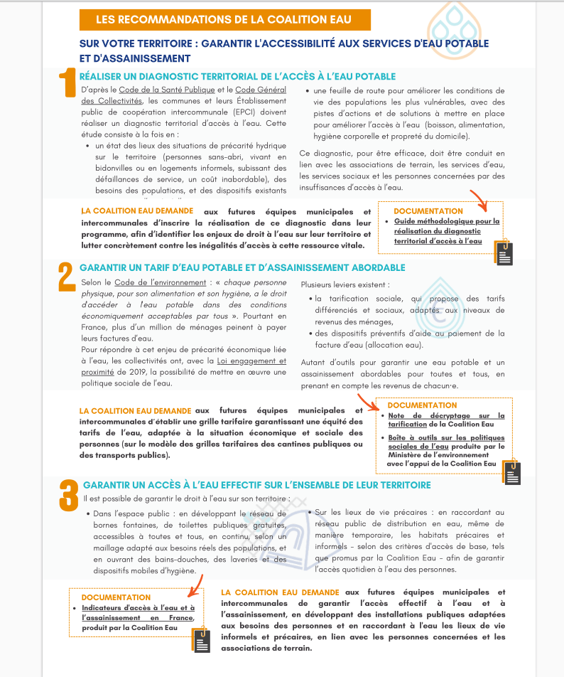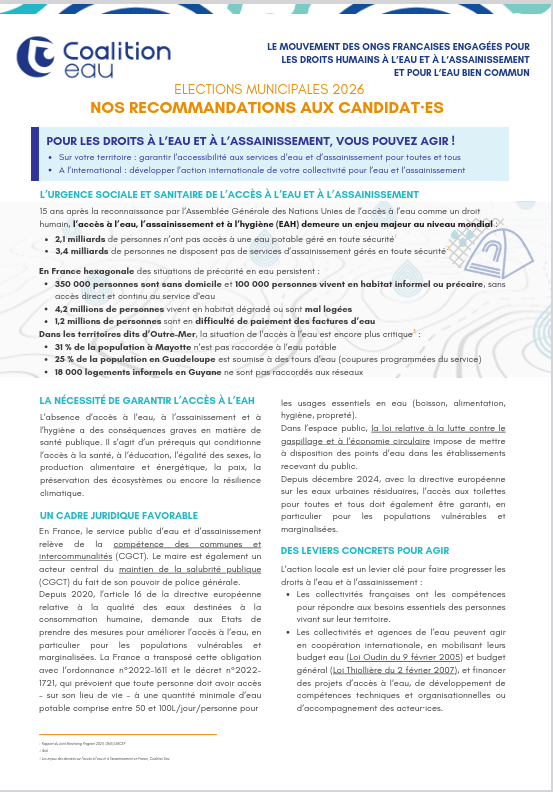 Alors que se tient, le 107ème Congrès des Maires et des Présidents d’intercommunalités de France, et que la campagne pour les élections municipales de mars 2026 s’accélère, la Coalition Eau soumet 6 recommandations aux candidats et candidates pour des droits à l’eau et à l’assainissement effectifs sur leur territoire et à l’international.