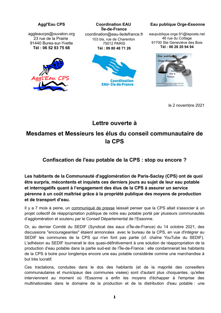 C’est une démarche sans précédent à Paris-Saclay que cette lettre ouverte des associations d’usagers de l’eau potable de CPS, « Aggl’eau CPS », du centre Essonne « Eau publique Orge-Essonne », et de la « Coordination eau Ile de France :