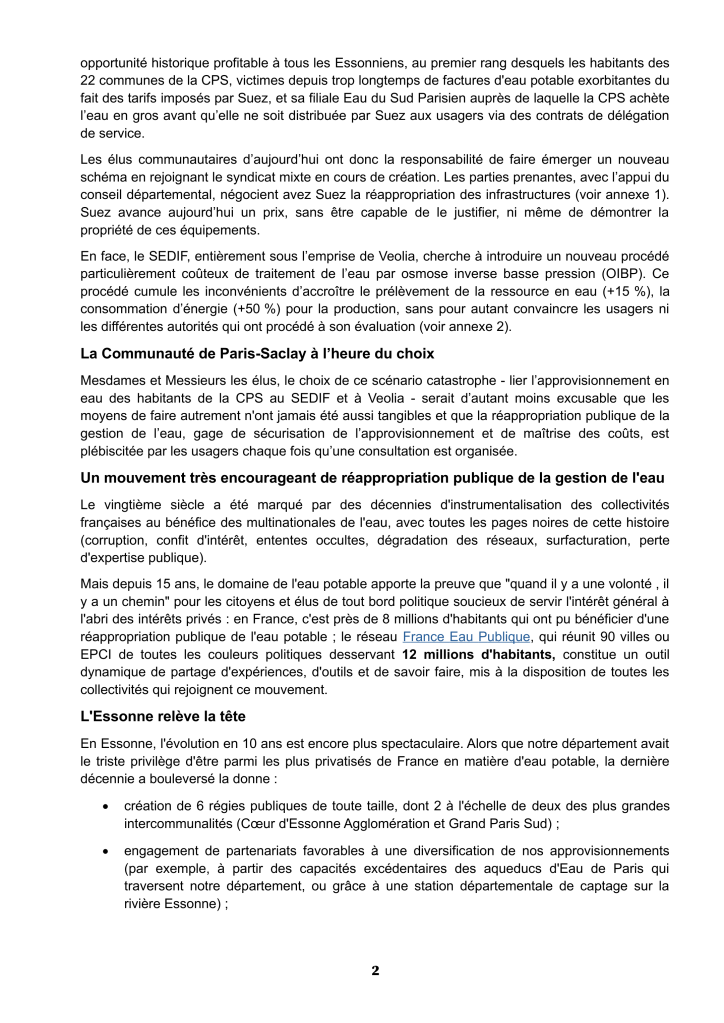 Pendant que les dirigeants de CPS font bande à part , d’autres ont bien compris le bénéfice à retirer de cette situation. Le Comité du Sedif du 14 octobre a été l’occasion pour son président à vie, Santini, d’affirmer publiquement son ambition confiante d’absorber dans le SEDIF les 22 communes de Paris-Saclay qui n’en font pas partie. Une opération indispensable pour compenser la perte des 14 communes de petite couronne parties pour échapper à l’emprise de Veolia et au nouveau racket prévu dans le cadre de son futur contrat, avec » l’opération OIBP » (voir nos articles précédents sur ce blog au sujet de cette nouvelle technique de traitement de l’eau potable, catastrophique pour le prix de l’eau et pour l’environnement)