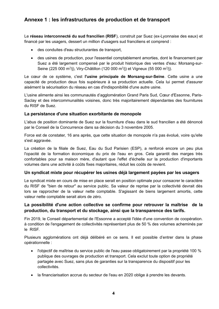 L’année 2021 en Essonne est en effet potentiellement celle d’un tournant historique, à travers la création d’un syndicat mixte (c’est-à-dire-réunissant des collectivités et établissements territoriaux de différents statuts) pour reprendre en maîtrise publique les usines de productions et les canalisations de transport d’eau du RISF , réseau interconnecté du sud-francilien aujourd’hui détenu par Suez: un réseau qui approvisionne majoritairement les agglomérations de GrandParis-sud , Coeur d’Essonne, Val d’Yerres-Val de Seine et Paris Saclay en Essonne et même une partie du Val de Marne, et plus d’un million d’habitants. Une situation qui permet à Suez d’imposer un prix d’eau « en gros » de l’ordre du double du prix de revient. Difficile de faire une estimation plus précise, Suez s’étant toujours opposé à fournir le moindre justificatif pour son prix de vente. En tout cas, un prix fondé sur un niveau d’amortissement des usines et des tuyaux tel qu’ils sont déjà largement amortis et remboursés par les usagers à travers leurs factures.