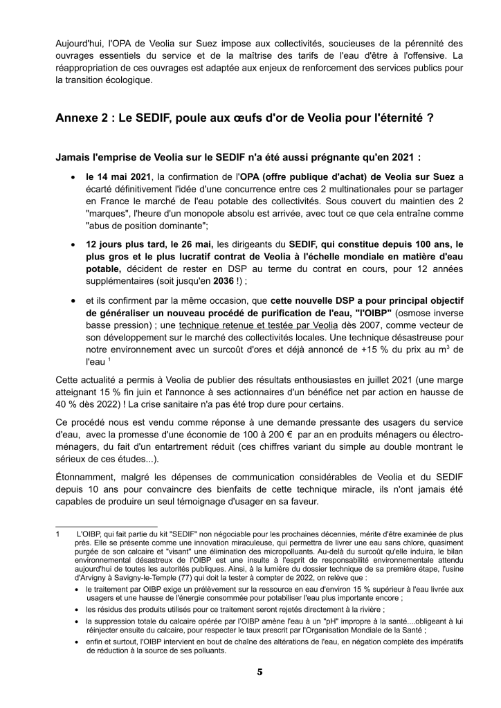 Une opération pharaonique conçue à l’échelle des 250 millions de mètres cubes d’eau du contrat initial du Sedif , un volume potentiellement réduit de 15% par le départ des 14 communes , d’où l’impérieuse urgence de trouver de nouveaux pigeons pour écouler « l’eau plus pure que pure » produite par OIBP (osmose inverse basse pression. Un projet qui prend l’eau aujourd’hui, du fait des avis défavorables qu’il suscite, tant son bilan environnemental est désastreux.