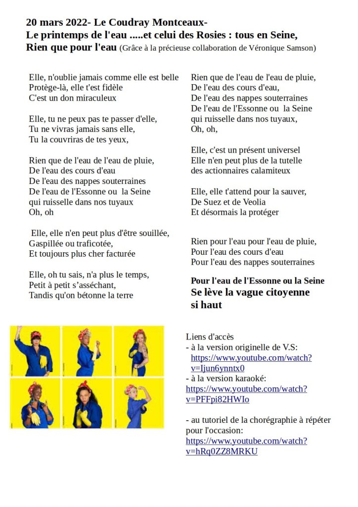 Sachez que cette manifestation marquera également le déconfinement des Rosies qui vous proposent de vous joindre à elle pour une nouvelle Choré-Chanson « Rien que pour l’eau » avec l’aimable contribution de Véronique Sanson.