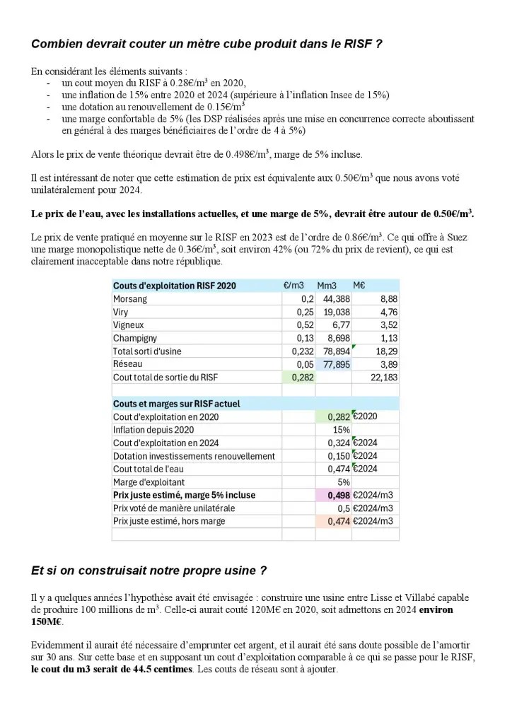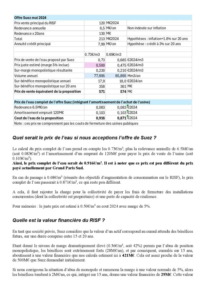 Ci-dessous, l’analyse remarquable qui détaille cette arnaque à long terme, rédigée par Pierre Prot Conseiller délégué à l’Energie et aux réseaux de Grand Paris Sud, et Jean-Pierre Gaillet siégeant à la régie Eau de GPS au titre d’Attac Centre-Essonne. Cette étude met en exergue que cette « offre » revient , au terme de ces 20 ans de prolongation de notre prise d’otage par Suez, à exiger 500 millions d’Euros pour la restitution des usines de production d’eau potable. Des outils, rappelons-le, pourtant déjà largement payés à travers le règlement de nos factures d’eau potable depuis 50 ans.