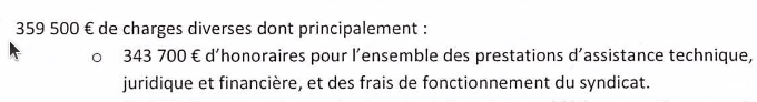 Notre Agglo n’a toujours pas bénéficié pas des achats à prix réduit de l’eau de Suez ( 45 puis 55 cts au m3 payés à Suez et 28 cts de provisions dans l’attente de l’issue du contentieux avec Suez). Pour autant, elle contribue plein pot aux dépenses du SESF depuis 3 ans, essentiellement donc en frais d’honoraires pour défendre les intérêts du SESF et de ses usagers face à Suez.