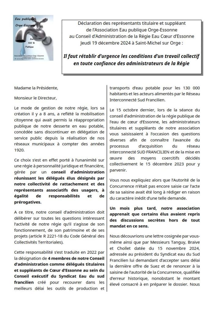 La légitimité des citoyens et représentants d’associations au sein du conseil d’administration de la régie publique est double : d’une part, parce que la régie doit son existence au travail conduit, avec force et persévérance, par ces citoyens et ces associations ; elle est, d’autre part, économique car dans l’histoire ce sont bien les citoyens qui paient tout : la ressource, les infrastructures, leur entretien et le service, faisant l’objet d’un budget propre. Il est donc essentiel de rappeler très fort cette légitimité.