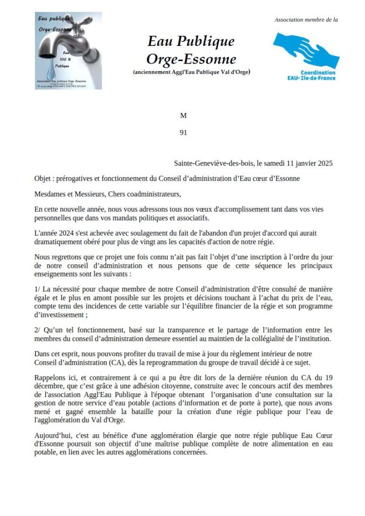 Si l’année 2024 s’est heureusement terminée par la mise en échec de l’accord de capitulation préparé secrètement par certains de nos élus, la dernière réunion du CA de notre régie le 19 novembre en avait subi les dégâts collatéraux, avec une agressivité extrême des élus en question, n’ayant pas supporté que leurs agissements soient révélés et dénoncés au grand jour. Soucieux de ne pas nous voir embarquer dans des polémiques et des conflits internes à notre régie, dont nos prédateurs se seraient réjouis, nous avons souhaiter prendre du recul avec adressant à chacun des autres administrateurs nos vœux de confiance et solidarité renforcé pour faire prévaloir l’intérêt des usagers et salariés de notre régie. En proposant de saisir l’opportunité du groupe de travail prévu pour mettre à jour le règlement intérieur de notre conseil d’administration pour en améliorer le partage d’informations et de de décisions. Affaire à suivre.