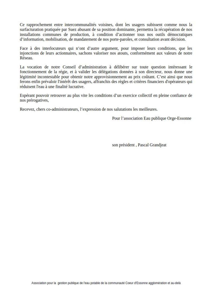 Selon nous, l’État doit s’engager pour consacrer le caractère public de nos installations de production d’eau, tenant compte de la spécificité de l’histoire de notre région, (l’éparpillement des communes, lors de la construction des installations construites pour la desserte du sud francilien, le pilotage étatique des villes nouvelles) ; un contexte propice aux manœuvres de Suez pour retarder la restitution de ces biens publics.
