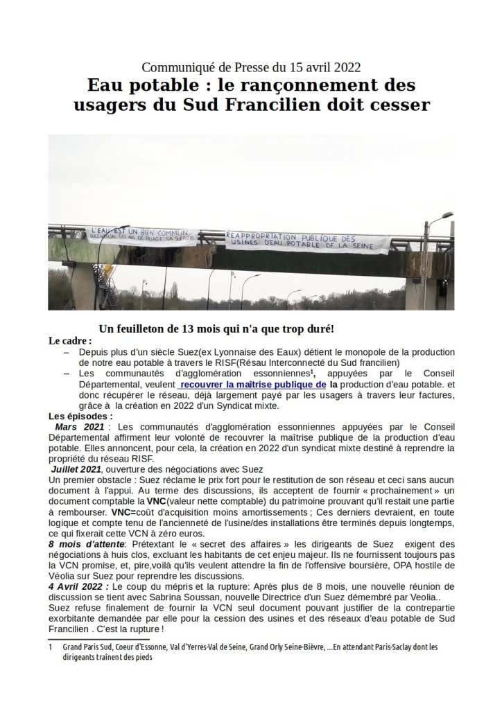 Face au constat du caractère avéré de la surfacturation de l’eau en gros vendue par Suez aux collectivités gérant la distribution d’eau potable, GRAND PARIS SUD (GPS) avait été la première intercommunalité à passer de la protestation à l’action. Au premier janvier 2022, à l’expiration de sa convention pluriannuelle d’achat, GPS s’est retrouvée confronté à l’exigence exorbitante de Suez de reconduire une convention fixant un prix de vente supérieur d’au moins 75% au coût de production de l’eau livrée.