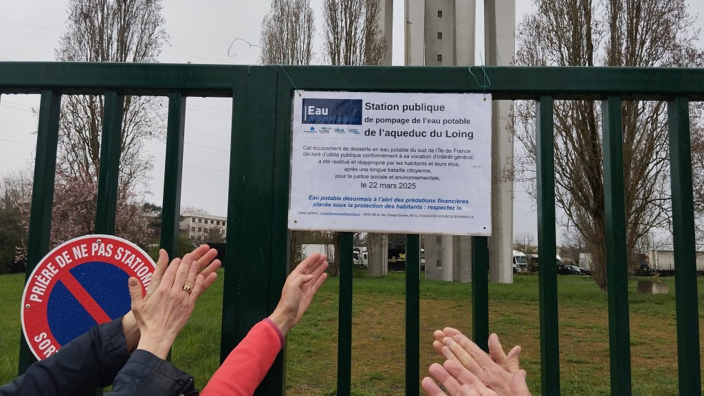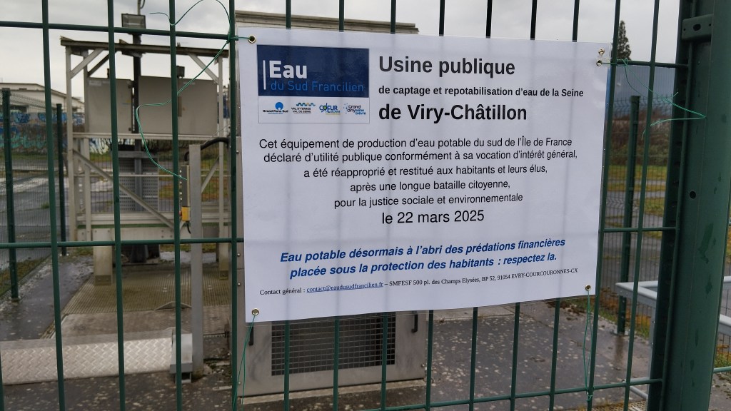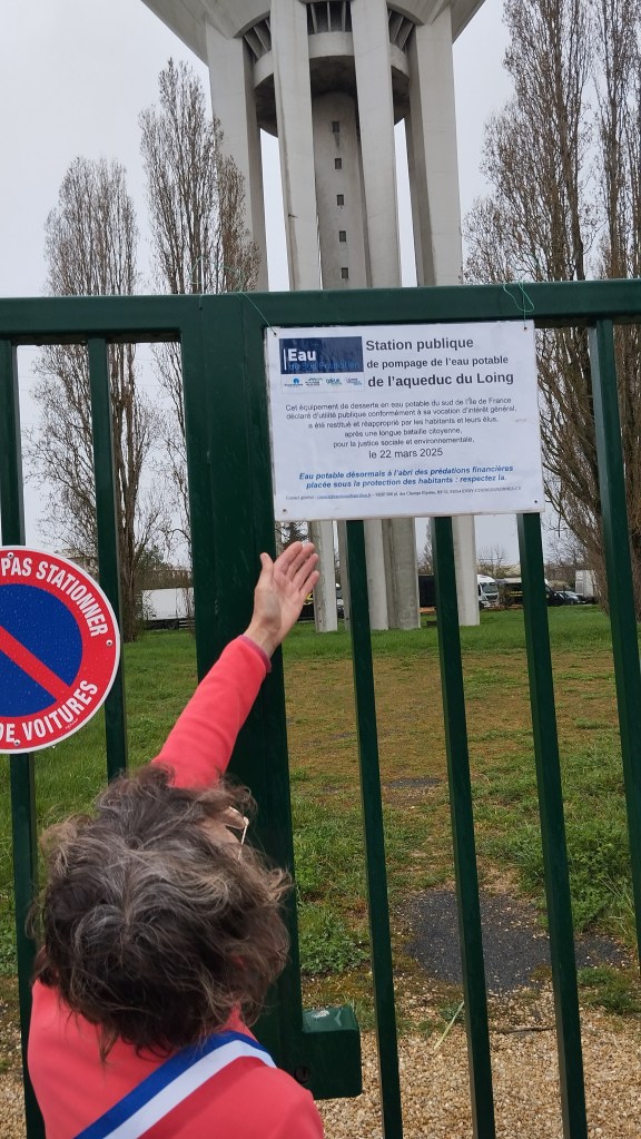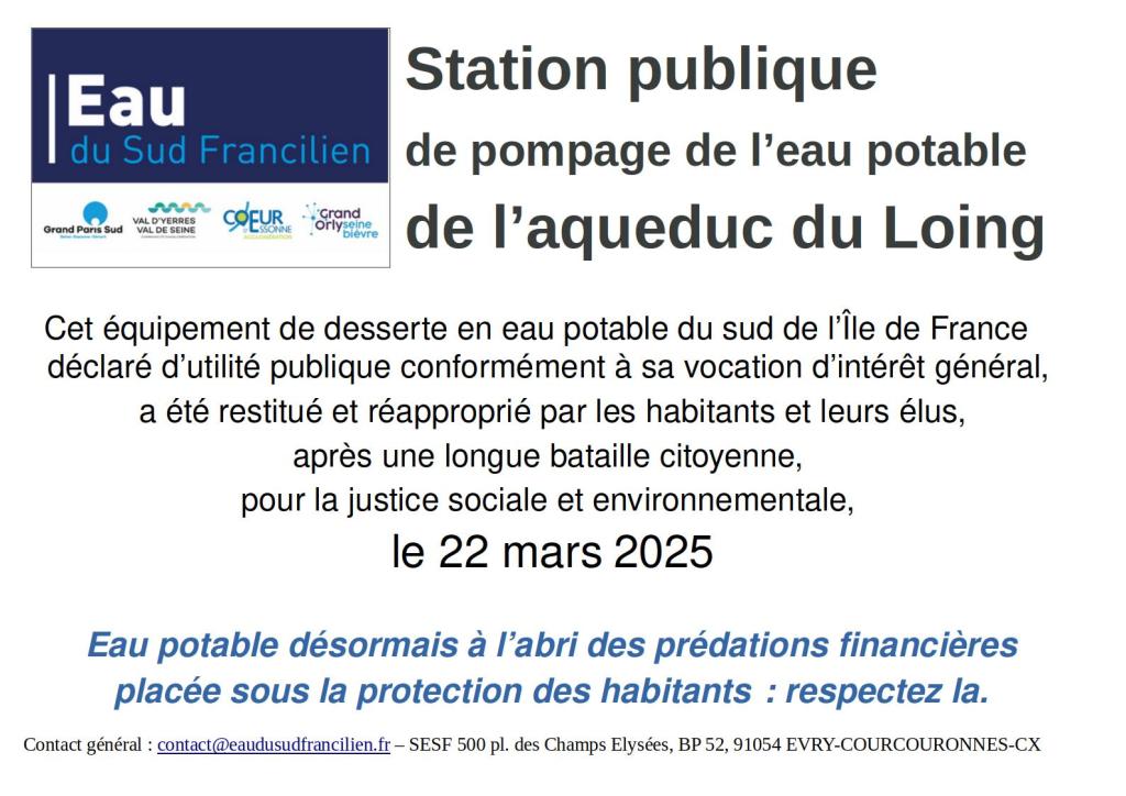 D’abord , la réappropriation citoyenne de 2 des installations du Réseau de Production d’eau potable séquestrées jusqu’alors par Suez, l’usine de potabilisation d’eau de Seine de Viry-Châtillon et la station de pompage de l’aqueduc du Loing de Ris-Orangis.