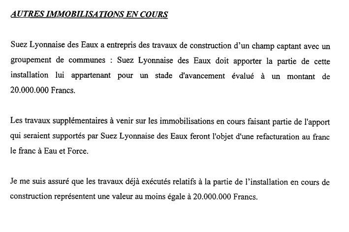 On découvre surtout dans le bilan de l’exercice 1998 qu’ESP payera 192 800 000 francs (29 790 000 euros) par an de loyer à Eau et force pour 20 ans, soit jusqu’au 31 décembre 1997! Au terme de ce bail de 20 ans ce loyer aura atteint 40 405 000 euros par an, correspondant à une hausse de 35 % en 20 ans.. La fusion absorption d’Eau et Force par Suez intervenue cette année là , s’est traduite par une nouvelle augmentation exorbitante du loyer payé par ESP à Suez de 30 %! pour les mêmes installations, soit 90 % du montant facturé aux distributeurs.
