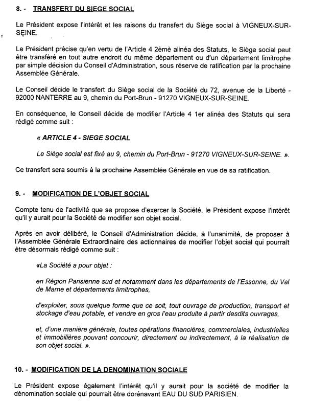 L’Assemblée Générale d’ESP du 1er mars 2024, convoquée sans même en aviser les administrateurs-censeurs de la SA, valident sa transformation, en SAS , ce qui emporte ipso facto la suppression de son CA, et, de ce fait, de tout droit de regard des représentants des collectivités desservies y siégeant à titre de censeurs avec voix consultative. (AG convoquée pourtant statutairement par ce même CA). Il faut dire que , à compter de 2021 la préparation puis la mis en œuvre du syndicat Eau du sud francilien s’était accompagné de la nomination de nouveaux censeurs (Mme Mayeur, et MM. Rio ,Teillet et Carrère) qui avaient eu l’outrecuidance de poser des questions sur les comptes qui leur étaient présentés.