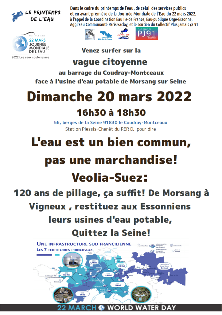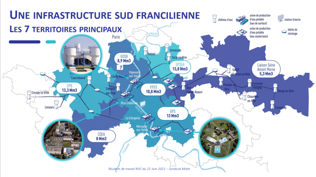 –Palaiseau, alimentée également par de l’eau prélevée dans la Seine, mais cette fois par l’usine du SEDIF concédée à Veolia à Choisy-le-Roi, au même titre que les autres communes du sud franciliens alimentées à partir de cette usine
